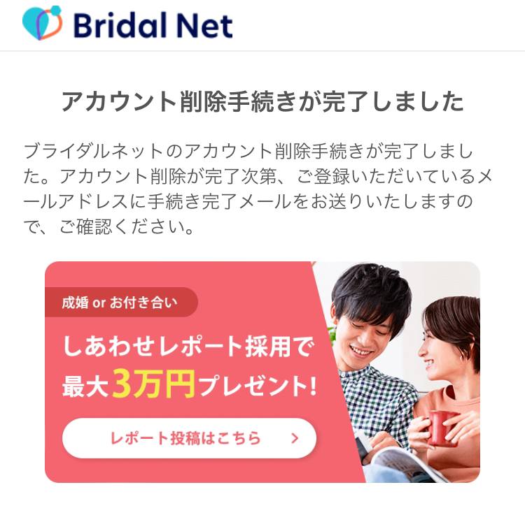 アンケートに回答して「ブライダルネットからアカウント削除する」を選択すれば退会手続きは完了です!